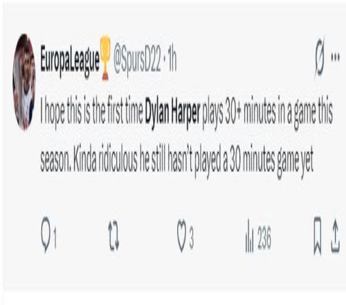 美球迷:我太希望哈珀这场比赛能登场超过30分钟,令人惊讶的是作为榜眼他本赛季竟然一场30分钟以上的比赛都没有。